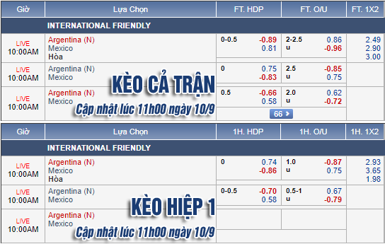 AEGoal.net chốt kèo trực tiếp trận Argentina vs Mexico diễn ra lúc 09h00 ngày 11/9 sau khi dựa trên tính toán, chuyển động về kèo châu Á và đội hình ra sân của 2 đội.