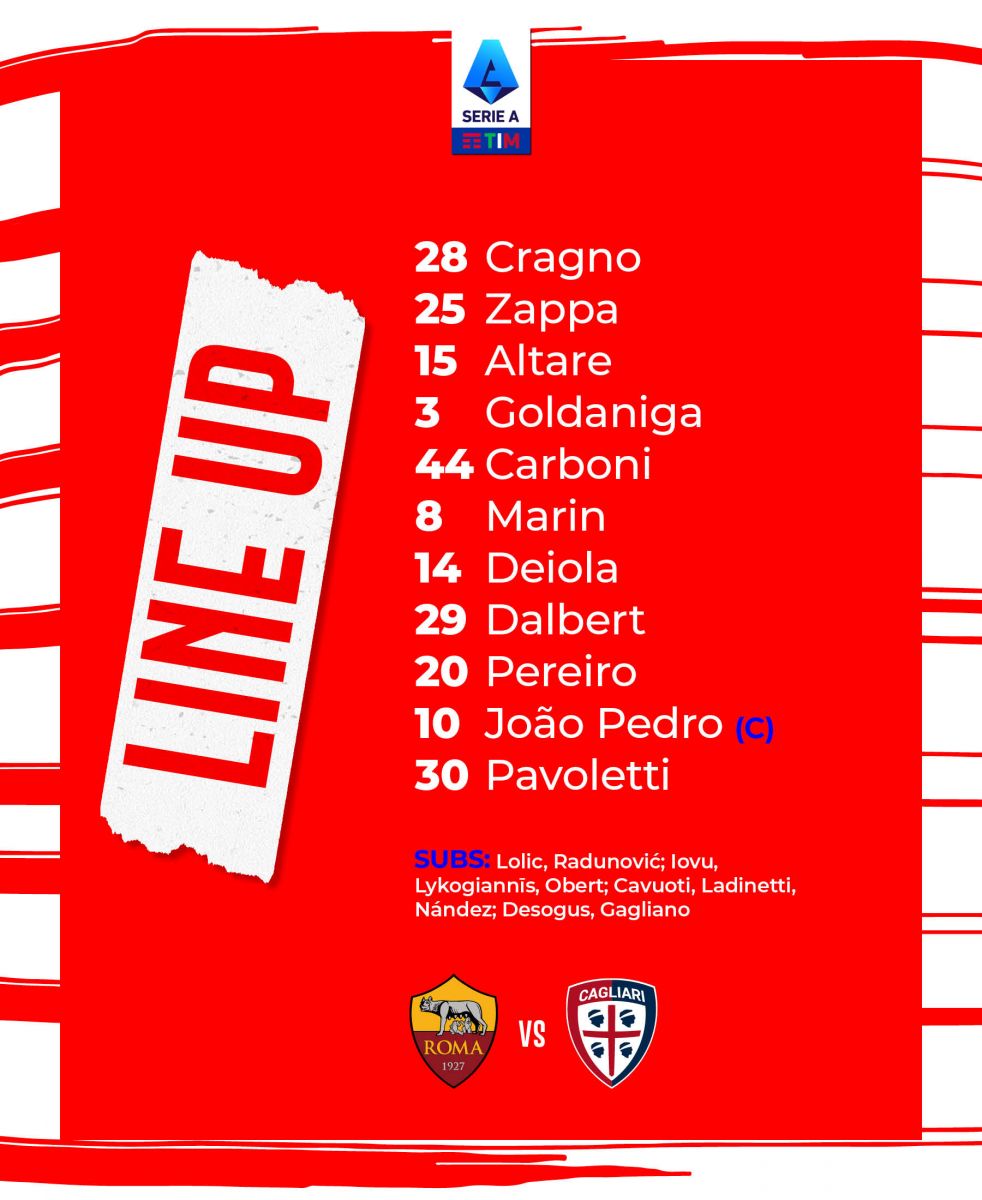 Cagliari: Cragno; Altare, Lovato, Carboni; Bellanova, Nandez, Grassi, Marin, Lykogiannis; Pedro, Pavoletti