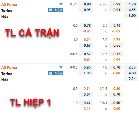 Ở thời điểm hiện tại tỷ lệ chấp chính của đội chủ nhà AS Roma vẫn được nhà cái châu Á duy trì ở mức 3/4 như thời điểm sáng nay, điểm ăn của cửa trên được điều chỉnh tăng so với trước đây nhưng không quá nhiều. Tương tự bên phía tỷ lệ tài xỉu, mốc 2 3/4 vẫn là mốc chính của trận đấu, điểm ăn cửa tài được điều chỉnh giảm đôi chút so với trước đây.