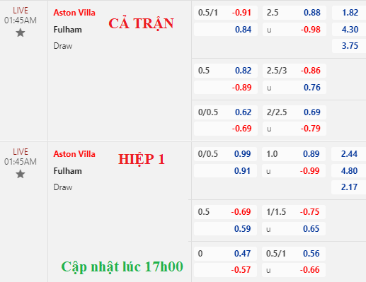 Trên sàn châu Á, tài xỉu vẫn là 2 1/2 với điểm ăn thấp hơn ở cửa tài, nhưng kèo châu Á Aston Villa chấp 3/4 không còn bỏ sâu, thay vào đó tiến đến mức ăn đủ. Trước đối phương đang có phong độ và thứ hạng không tồi, việc Aston Villa chấp như vậy là khả quan dành cho chủ nhà trận này.