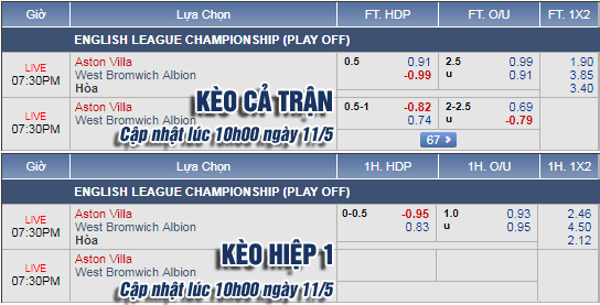 AEGoal.net chốt kèo trực tiếp trận Aston Villa vs West Brom diễn ra lúc 18h30 ngày 11/5 sau khi dựa trên tính toán, chuyển động về kèo châu Á và đội hình ra sân của 2 đội.
