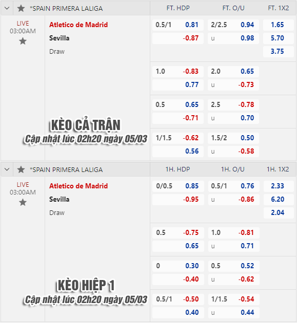 AEGoal chốt kèo bóng đá trực tiếp trận Atletico Madrid vs Sevilla diễn ra lúc 03h00 ngày 04/3 trong khuôn khổ giải VĐQG Tây Ban Nha sau khi dựa trên tính toán, chuyển động về kèo châu Á và đội hình ra sân của 2 đội.