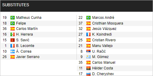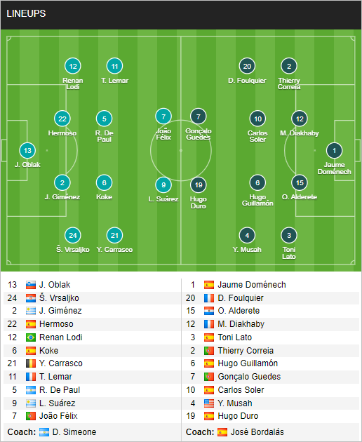 Atletico Madrid: Oblak; Vrsaljko, Hermoso, Gimenez, Lodi; Lemar, De Paul, Koke, Carrasco; Suarez, Cunha
