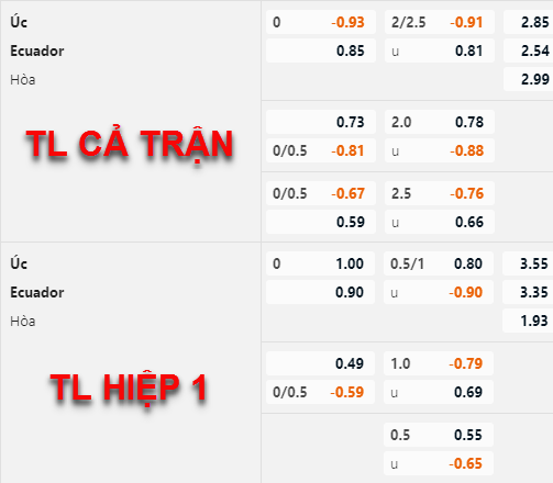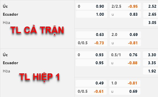 Tỷ lệ chính của trận đấu vẫn đang được duy trì ở mức 0:0 nhưng hiện tại điểm ăn của ĐT Australia đang có xu hướng tăng điểm, mức tăng này là tương đối nhiều so với lần chúng tôi cập nhật sáng nay. Trong khi đó tỷ lệ tài xỉu của trận đấu ít biến động hơn, mốc 2 1/4 vẫn là mốc chính của trậu đấu, điểm ăn của cửa xỉu đã được điều chỉnh giảm nhưng không nhiều.
