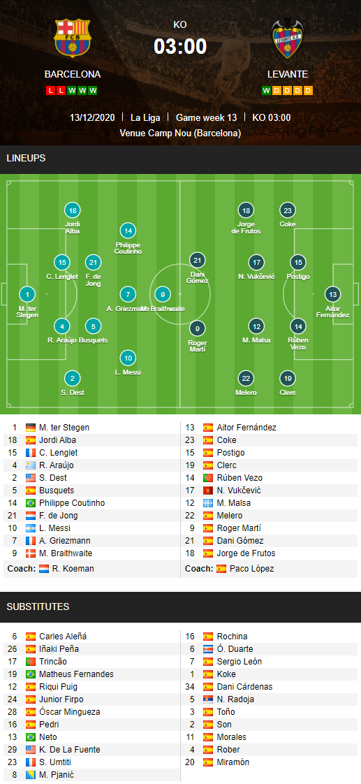 - Trận đấu: Barcelona vs Levante (Vòng 13 - VĐQG Tây Ban Nha)