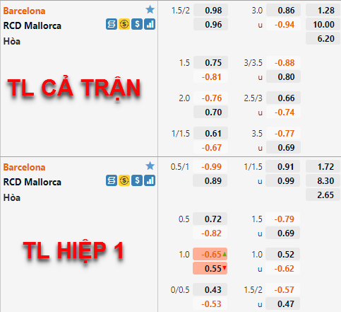 Tỷ lệ của Barcelona có xu hướng tăng điểm thời gian vừa qua. Hiện tại trên sàn giao dịch châu Á đội chủ nhà đã có tỷ lệ chấp chính ở mức 1 3/4 thay cho mức 1 1/2 ở lần chúng tôi cập nhật trước. Mốc tài xỉu của trận đấu lại không có biến động nào đáng kể, mốc 3 hoà vẫn là mốc chính của trận đấu và điểm ăn 2 cửa gần như không có thay đổi.