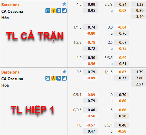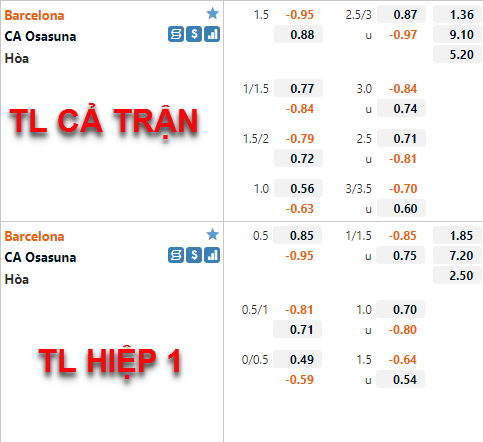 Tỷ lệ chấp của trận đấu không có nhiều biến động thời gian vừa qua. Hiện tại Barcelona vẫn đang duy trì mức chấp 1 1/2 trên sàn giao dich châu Á, điểm ăn của cửa trên đã được điều chỉnh giảm so với lần chúng tôi cập nhật trước nhưng không nhiều. Tương tự bên phía tỷ lệ tài xỉu, mốc 2 3/4 tiếp tục được duy trì là mốc chính của trận đấu, điểm ăn của cửa tài có xu hướng giảm so với trước đây nhưng không nhiều.