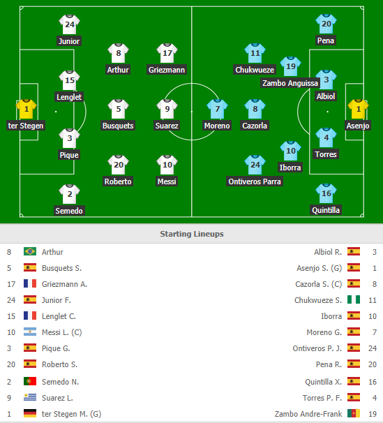 - Barcelona: Jordi Alba và Samuel Umtiti vắng mặt vì chấn thương; trong khi Ousmane Dembele đã trở lại tập luyện nhưng chưa chắc chắn ra sân; còn Rakitic không được đăng ký thi đấu.