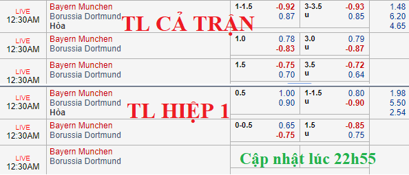 Kèo chấp 1 hòa lúc sáng ngày 06/04 của Bayern đã được tăng lên thành 1 1/4 với điểm bỏ (-0.92) trước giờ bóng lăn hơn 30 phút. Trong khi đó, mốc tài xỉu tuy vẫn giữ nguyên nhưng lợi nhuận cho cửa tài bất ngờ dịch chuyển lên mức bỏ sâu (-0.93). Đây là điều tương đối bất ngờ bởi 2 đội đều là những CLB ưa thích lối chơi tấn công.