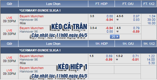 AEGoal.net chốt kèo trực tiếp trận Bayern Munich vs Hannover diễn ra lúc 20h30 ngày 04/5 sau khi dựa trên tính toán, chuyển động về kèo châu Á và đội hình ra sân của 2 đội.
