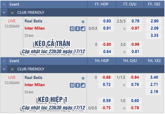 AEGoal chốt kèo bóng đá trực tiếp trận Betis vs Inter Milan diễn ra lúc 00h00 ngày 18/12 trong khuôn khổ trận đấu giao hữu cấp CLB sau khi dựa trên tính toán, chuyển động về kèo châu Á và đội hình ra sân của 2 đội.