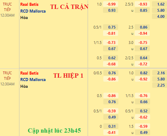 Sàn châu Á vẫn ghi nhận kèo chủ chấp 1 hòa như phiên khớp lệnh mà chúng tôi update. Tỷ lệ chấp như vậy trong bối cảnh hiệp 1 chỉ chấp 1/4 là chưa khả quan với Betis, nhất là khi đối phương đang cận kề khu vực cầm đèn đỏ.