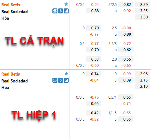 Biến động trên sàn giao dịch châu Á đang điểm lại những dấu hiệu tích lựa cho lựa chọn cửa dưới và tài trận này. Nhưng theo chúng tôi mặc dù Betis đang duy trì trước phong độ ấn tượng nhưng với lực lượng hiện tại Sociedad cũng không dễ bị bắt nạt, không dễ để lựa chọn kèo Handicap trận này. Nhưng với lối chơi tương đối cởi mở của Sociedad thì chọn cửa tài sẽ là một lựa chọn đáng lưu ý.