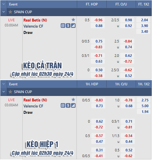 AEGoal chốt kèo bóng đá trực tiếp trận Betis vs Valencia diễn ra lúc 03h00 ngày 24/4 trong khuôn khổ cúp nhà Vua Tây Ban Nha sau khi dựa trên tính toán, chuyển động về kèo châu Á và đội hình ra sân của 2 đội.