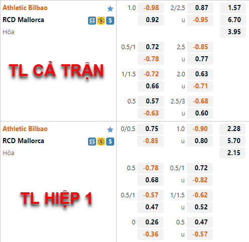Tỷ lệ chấp chính của Bilbao vẫn được duy trì ở mức 1 hoà nhưng hiện tại điểm ăn của cửa trên đã được điều chỉnh giảm đáng kể so với lần chúng tôi cập nhật trưa nay. Tương tự bên phía tỷ lệ tài xỉu cũng có điều chỉnh giảm điểm ăn của cửa tài và mốc chính của trận đấu vẫn được duy trì ở mức 2 1/4.
