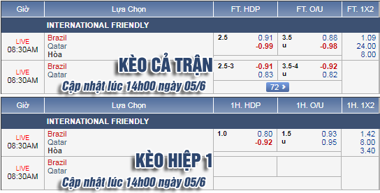 AEGoal.net chốt kèo trực tiếp trận Brazil vs Qatar diễn ra lúc 07h30 ngày 06/6 sau khi dựa trên tính toán, chuyển động về kèo châu Á và đội hình ra sân của 2 đội.