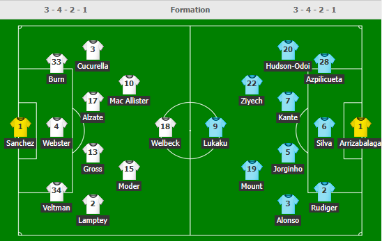 HLV Potter bất ngờ cất cả Maupay lẫn Trossard trên băng ghế dự bị trận này và đặt niềm tin vào Welbeck, cầu thủ chưa thể hiện được nhiều. Bên phía đối diện, Thomas Tuchel vẫn để Lukaku chơi cao nhất, Ziyech và Mount hỗ trợ phía sau.