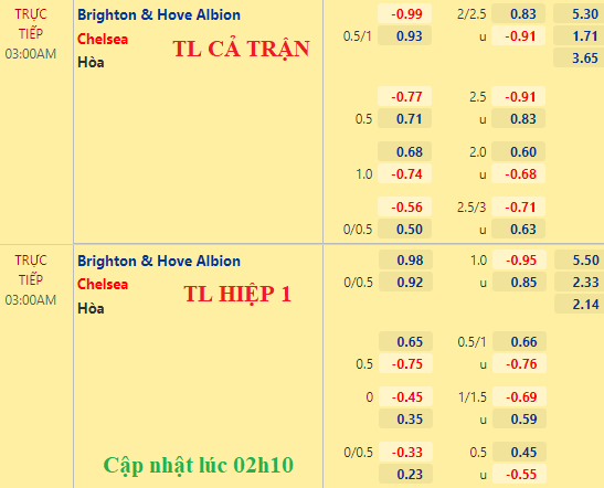 Với đội hình như vậy, Brighton mất giá trầm trọng. Vẫn là kèo Chelsea chấp 3/4 nhưng nếu như sáng 18/1, điểm ăn cho khách còn bỏ sâu thì trước giờ bóng lăn chừng 50p đã xuống thấp hơn cả cửa dưới. Tung vào sân những nhân tố như vậy, Brighton khó tạo nên bất ngờ như ở lượt đi.