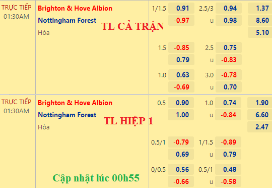 Trên sàn châu Á, Brighton vẫn duy trì kèo chấp 1 1/4 và điểm ăn cho họ đã có phần giảm nhẹ. Trong khi ấy thì tài xỉu 2 3/4 chứng kiến lợi nhuận cho 2 cửa dần trở nên cân bằng, thay vì mức bỏ như chiều 18/10. Nottingham vẫn còn quá nhiều vấn đề và với tỷ lệ như vậy, đội khách khó đứng vững trận này.