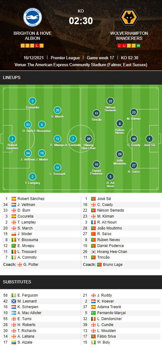 AEGoal chốt kèo bóng đá trực tiếp trận Brighton vs Wolves diễn ra lúc 02h30 ngày 16/12 trong khuôn khổ giải Ngoại hạng Anh sau khi dựa trên tính toán, chuyển động về kèo châu Á và đội hình ra sân của 2 đội.