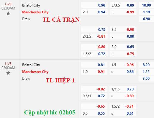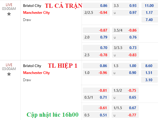 Tuy sử dụng đội hình mạnh nhưng Man City không có sức bật, thậm chí còn sụt giảm khi từ chấp 2 1/4 về còn 2 hòa. Tài xỉu 3 1/2 cũng bị kéo về còn 3 1/4, khó hứa hẹn về kịch bản tưng bừng khi Bristol City chắc chắn sẽ tử thủ.