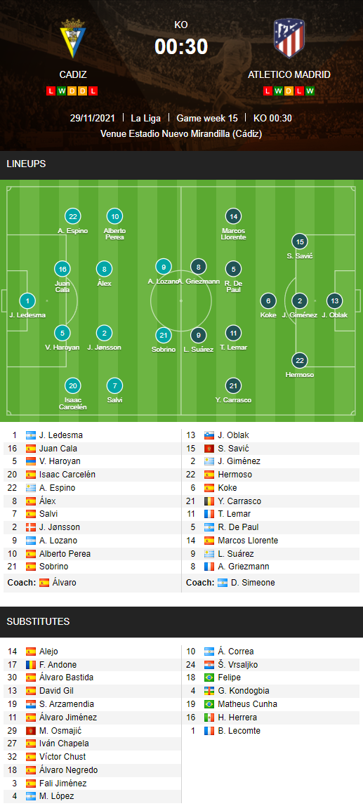 AEGoal chốt kèo bóng đá trực tiếp trận Cadiz vs Atletico Madrid diễn ra lúc 00h30 ngày 29/11 trong khuôn khổ giải VĐQG Tây Ban Nha sau khi dựa trên tính toán, chuyển động về kèo châu Á và đội hình ra sân của 2 đội.
