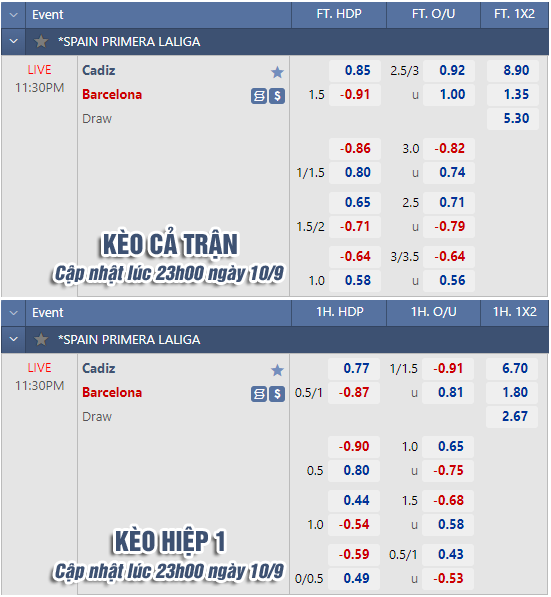 * Chốt kèo trận Cadiz vs Barcelona (23h30 ngày 10/09)