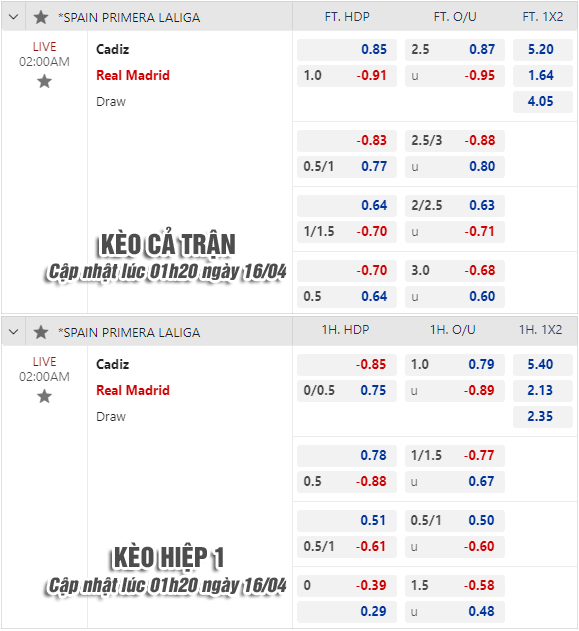 Đã có những thay đổi trong đội hình ra sân của Real Madrid nhưng về cơ bản, so với Cadiz họ vẫn hoàn toàn áp đảo. Vấn đề đáng ngại lúc này là diễn biến trên sàn giao dịch châu Á khi họ vẫn chỉ giữ kèo -1 cùng điểm ăn tăng mạnh khiến niềm tin cho họ bị nghi ngờ.