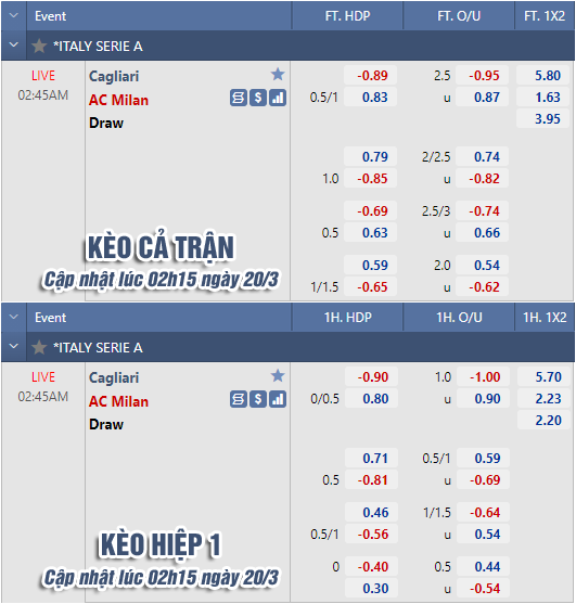AEGoal chốt kèo bóng đá trực tiếp trận Cagliari vs AC Milan diễn ra lúc 02h45 ngày 20/03 trong khuôn khổ giải VĐQG Italia sau khi dựa trên tính toán, chuyển động về kèo châu Á và đội hình ra sân của 2 đội.
