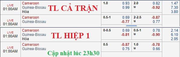 So với phiên khớp lệnh sáng ngày 25/6 thì tỷ lệ chấp của Cameroon vẫn giữ ở mức 1 hòa, tuy nhiên điểm ăn cho cửa trên dịch chuyển theo chiều hướng tích cực với cửa trên, từ mức -0.98 còn 0.93 trước giờ bóng lăn 30 phút. Trong khi đó, mức tài xỉu không có nhiều biến động đáng kể khi vẫn giữ ở mức 2 hòa.