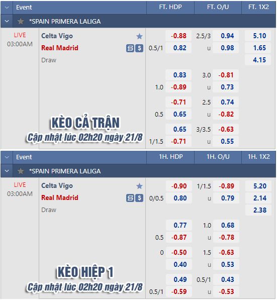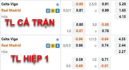 AEGoal chốt kèo bóng đá trực tiếp trận Celta Vigo vs Real Madrid diễn ra lúc 03h00 ngày 21/8 trong khuôn khổ giải VĐQG Tây Ban Nha sau khi dựa trên tính toán, chuyển động về kèo châu Á và đội hình ra sân của 2 đội.