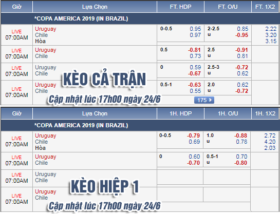 AEGoal.net chốt kèo trực tiếp trận Chile vs Uruguay diễn ra lúc 06h00 ngày 25/6 sau khi dựa trên tính toán, chuyển động về kèo châu Á và đội hình ra sân của 2 đội.
