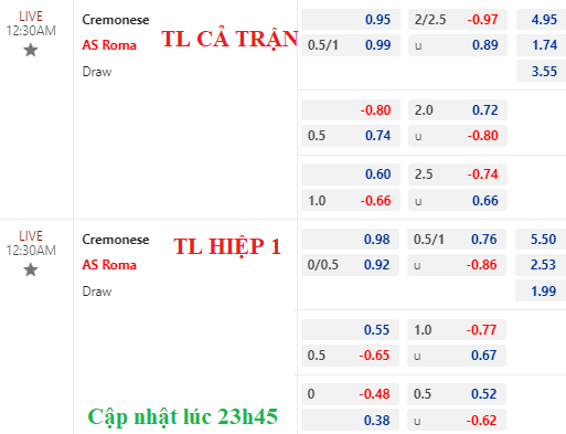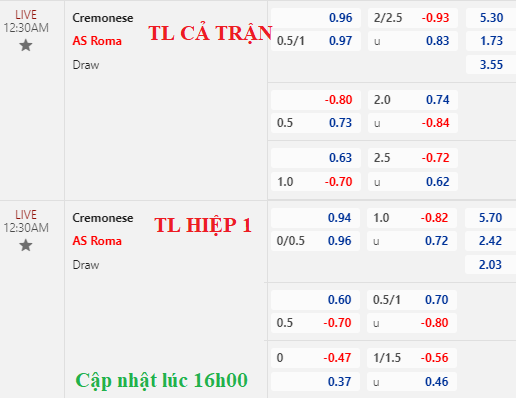 AEGoal chốt kèo bóng đá trực tiếp trận Cremonese vs AS Roma diễn ra lúc 00h30 ngày 01/03/2023 trong khuôn khổ giải VĐQG Italia sau khi dựa trên tính toán, chuyển động về kèo châu Á và đội hình ra sân của 2 đội.