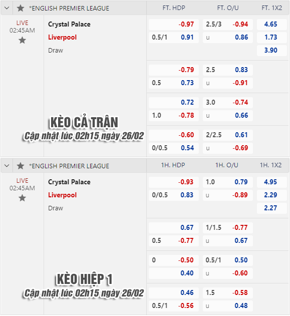 * Chốt kèo trận Crystal Palace vs Liverpool (02h45 ngày 26/2)