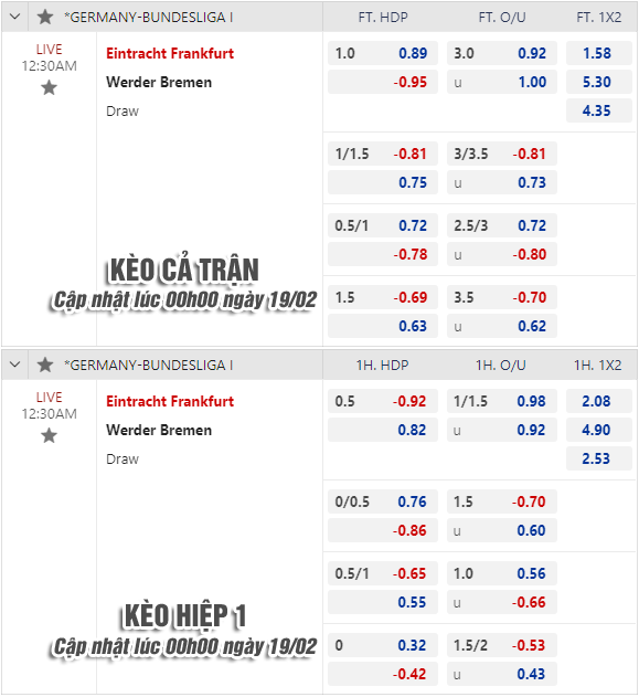 * Chốt kèo trận Eintracht Frankfurt vs Bremen (00h30 ngày 19/2)