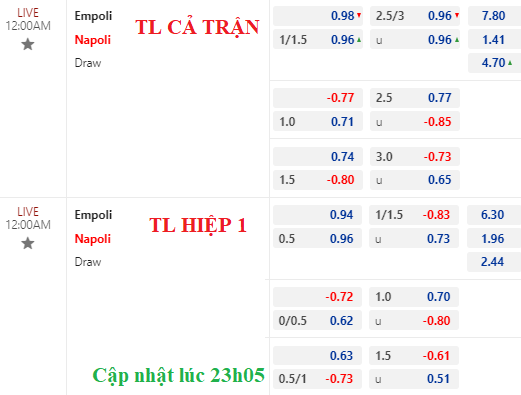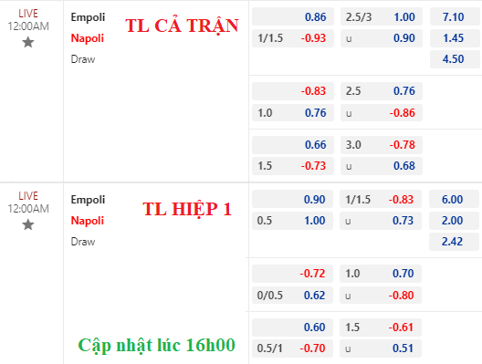 Trên sàn châu Á, Napoli vẫn chấp 1 1/4 nhưng điểm ăn cho 2 cửa đã trở nên cân bằng hơn, thay vì mức bỏ sâu cho khách như chiều nay. Trong khi đó, tài xỉu vẫn là 2 3/4 với lợi nhuận không chênh lệch giữa 2 cửa.