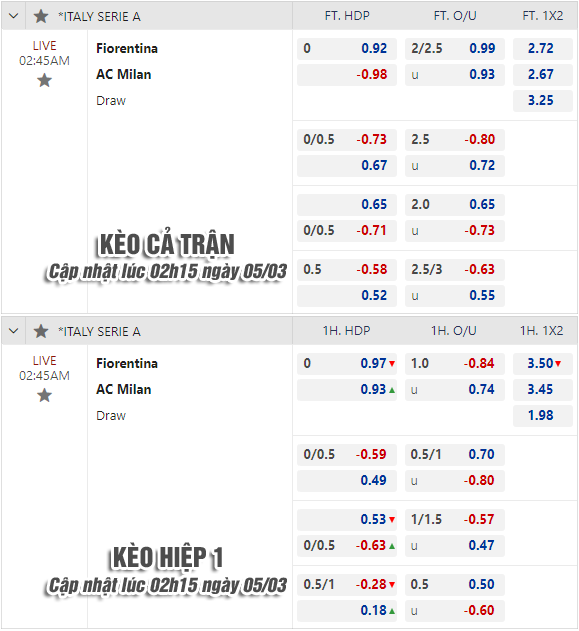 AEGoal chốt kèo bóng đá trực tiếp trận Fiorentina vs AC Milan diễn ra lúc 02h45 ngày 04/3 trong khuôn khổ giải VĐQG Italia sau khi dựa trên tính toán, chuyển động về kèo châu Á và đội hình ra sân của 2 đội.