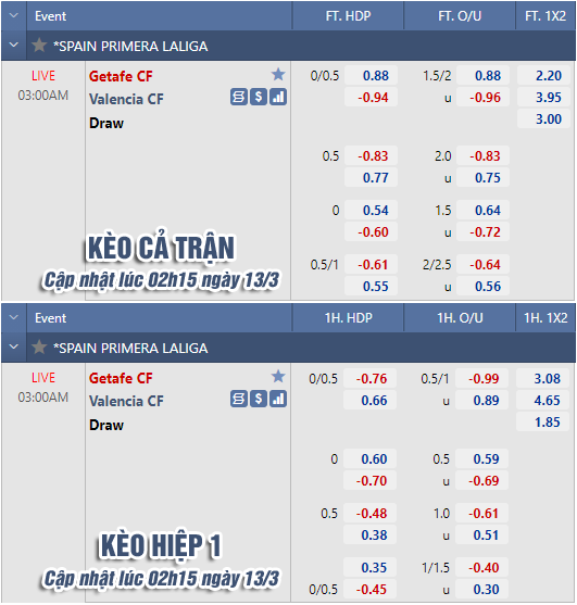 AEGoal chốt kèo bóng đá trực tiếp trận Getafe vs Valencia diễn ra lúc 03h00 ngày 13/3 trong khuôn khổ giải VĐQG Tây Ban Nha sau khi dựa trên tính toán, chuyển động về kèo châu Á và đội hình ra sân của 2 đội.