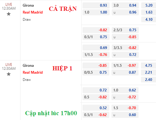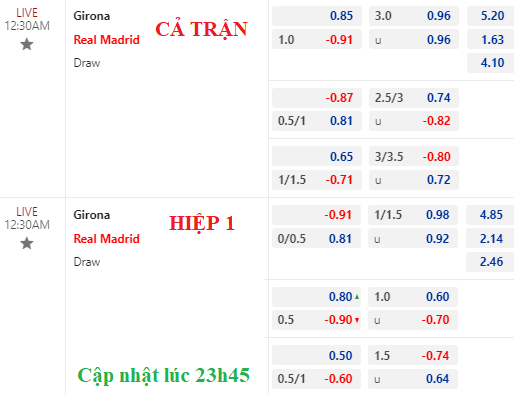 Vẫn là kèo chấp 1 hòa nhưng điểm ăn cho cửa Real lại bỏ sâu. Đáng nói là kèo hiệp 1 đội bóng Hoàng gia chấp có 1/4 càng khiến cửa trên trở nên đáng nghi ngại, đặc biệt khi Real không thể có đội hình tốt nhất.