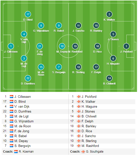 Ở đội hình xuất phát, trong khi Hà Lan không có sự thay đổi nào quá đáng kể thì bên phía ĐT Anh, Harry Kae đã không có tên trong đội hình xuất phát, thay vào đó là Rashford, trong khi những bị trí khác đã không có sự thay đổi nào quá đáng chú ý. Với cách sắp xếp thận trọng như vậy, rõ ràng sẽ khó cho kịch bản cởi mở diễn ra ở trận đấu tới đây.