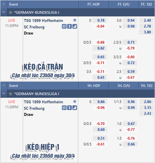 * Chốt kèo trận Hoffenheim vs Freiburg (23h30 ngày 30/4)