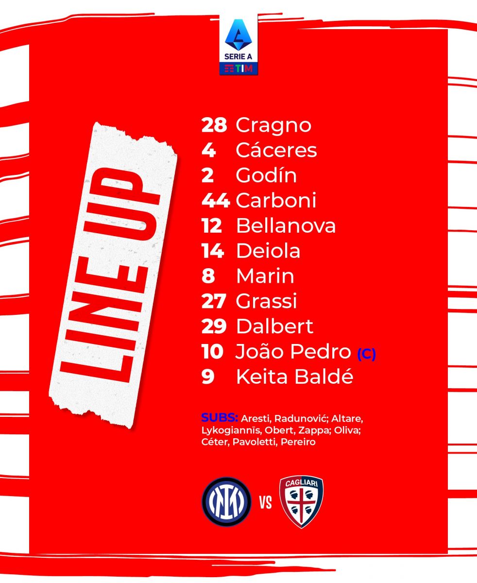 Cagliari: Cragno; Caceres, Ceppitelli, Carboni, Lykogiannis; Bellanova, Grassi, Marin, Dalbert; Pedro, Keita