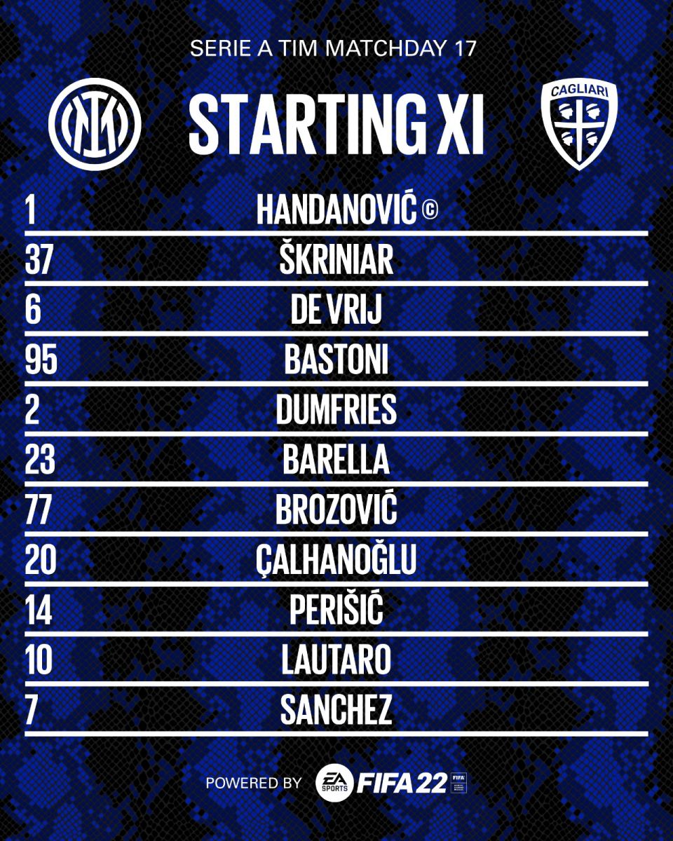 Inter Milan: Handanovic; Skriniar, De Vrij, Bastoni; Dumfries, Barella, Brozovic, Calhanoglu, Perisic; Martinez, Dzeko