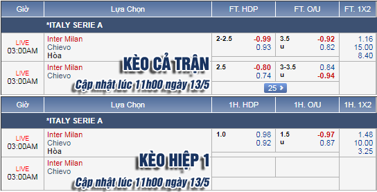 AEGoal.net chốt kèo trực tiếp trận Inter Milan vs Chievo diễn ra lúc 02h00 ngày 14/5 sau khi dựa trên tính toán, chuyển động về kèo châu Á và đội hình ra sân của 2 đội.