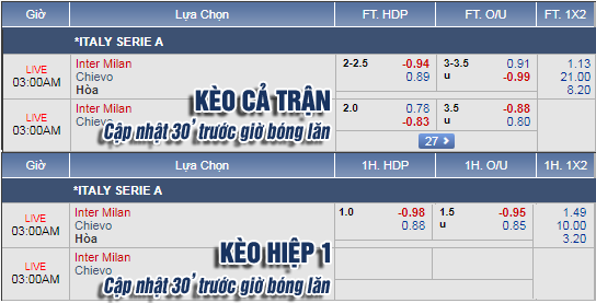 Tung ra đội hình với những hào thủ tốt nhất ở thời điểm hiện tại, Inter Milan đang cho thấy quyết tâm giành chiến thắng rất cao, tuy nhiên sự thay đổi trên sàn giao dịch châu Á khi có sự xuất hiện đội hình ra sân là không nhiều, mức chấp 2 1/4 của Inter Milan vẫn được giữa nguyên đến sát thời điểm bóng lăn, trong khi thang lợi nhuận cũng dịch chuyến không quá nhiều.