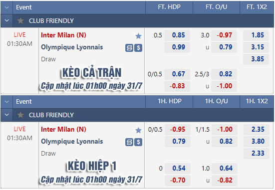 * Chốt kèo trận Inter Milan vs Lyon (01h30 ngày 31/7)