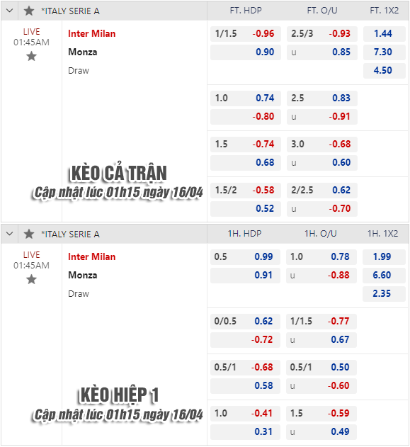 * Chốt kèo trận Inter Milan vs Monza (01h45 ngày 16/4)