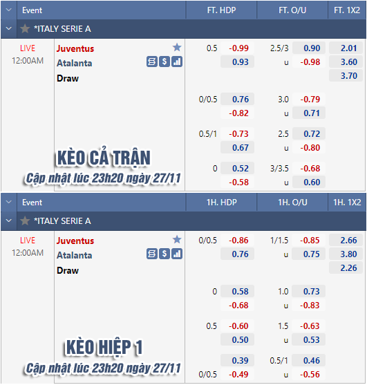 * Chốt kèo trận Juventus vs Atalanta (00h00 ngày 28/11)