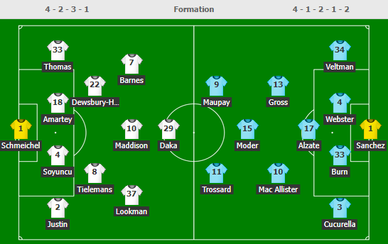 Daka tiếp tục sắm vai mũi nhọn trong bối cảnh Vardy chấn thương còn Iheanacho bận tham dự CAN, Justin trở lại hành lang cánh phải và Albrighton ngồi dự bị. Phía đối diện, Brighton có sự trở lại của đầy đủ trụ cột như Maupay, Trossard.