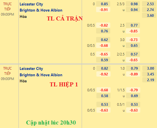 Chốt kèo trực tiếp trận Leicester City vs Brighton (21h00):